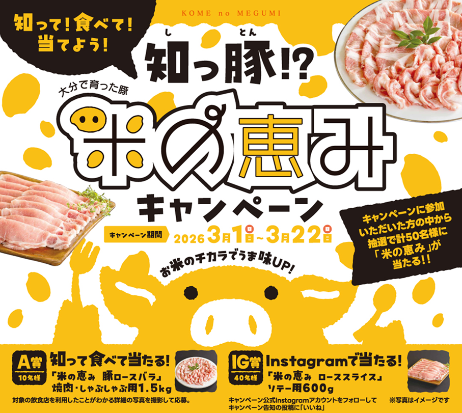 抽選で大分県産豚肉「米の恵み」が当たる!「知っ豚(しっとん)⁉米の恵みキャンペーン」がスタート!