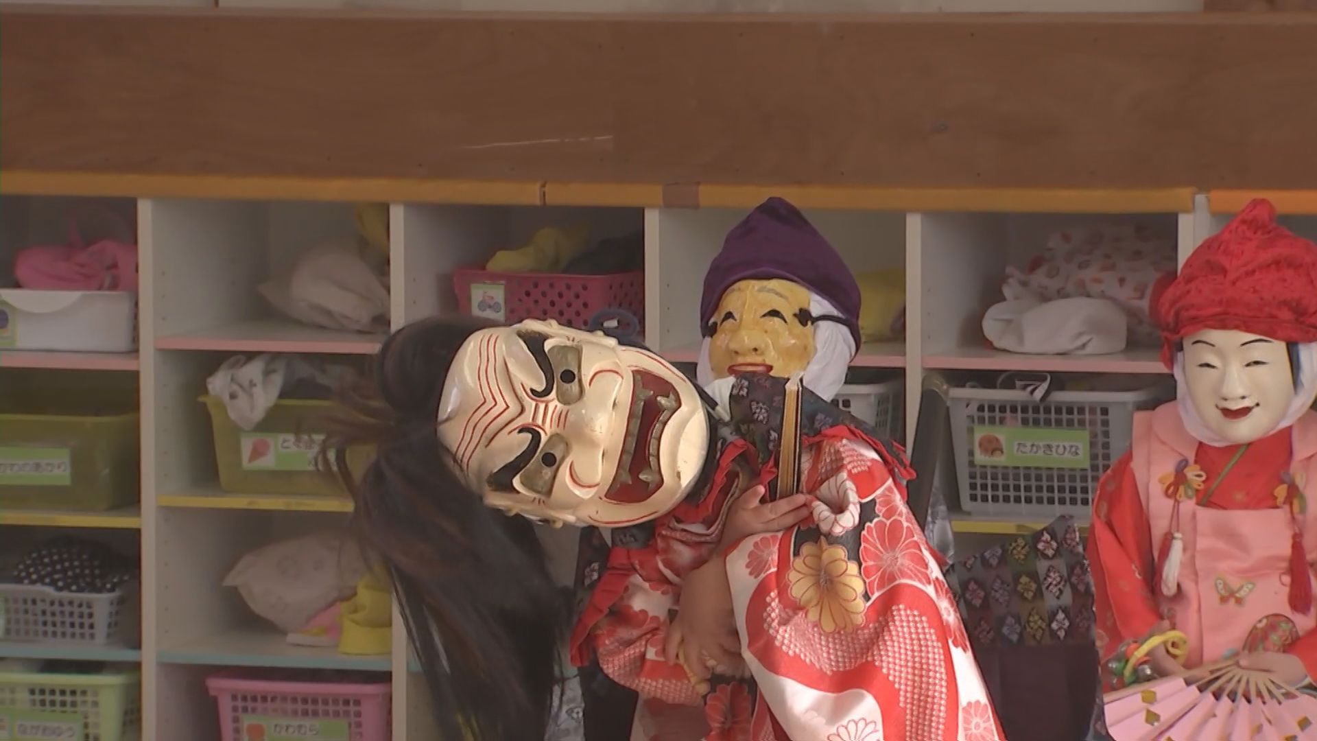 園児たちが伝統の神楽舞う 1年間の集大成披露 受け継ぐ後輩の園児に面や刀など手渡す 大分