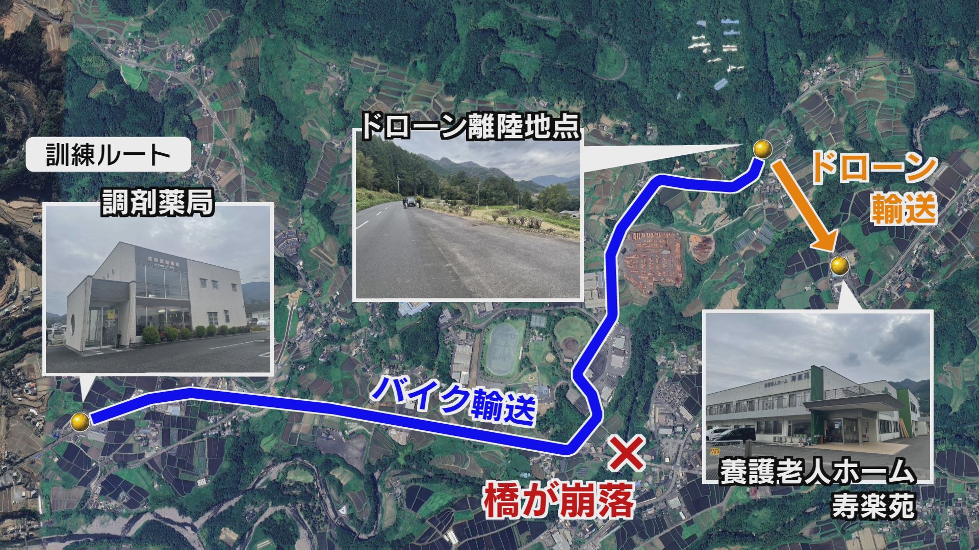 訓練は大地震の影響で薬局から薬を届ける老人ホームに向かう間の橋が崩落した想定です。このため、途中まではバイク隊が薬を運びその後ドローンに積み替えて届けます。