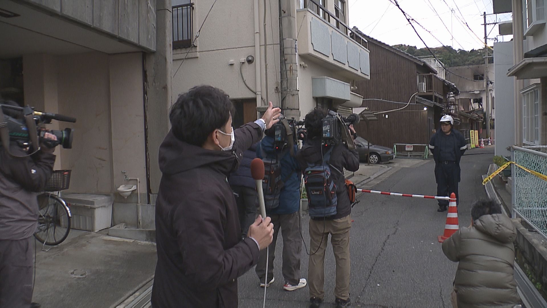 「規制線の幅が狭められました。火災現場の様子が少しづつ見えてきて、 奥の建物は黒く焼け焦げています」