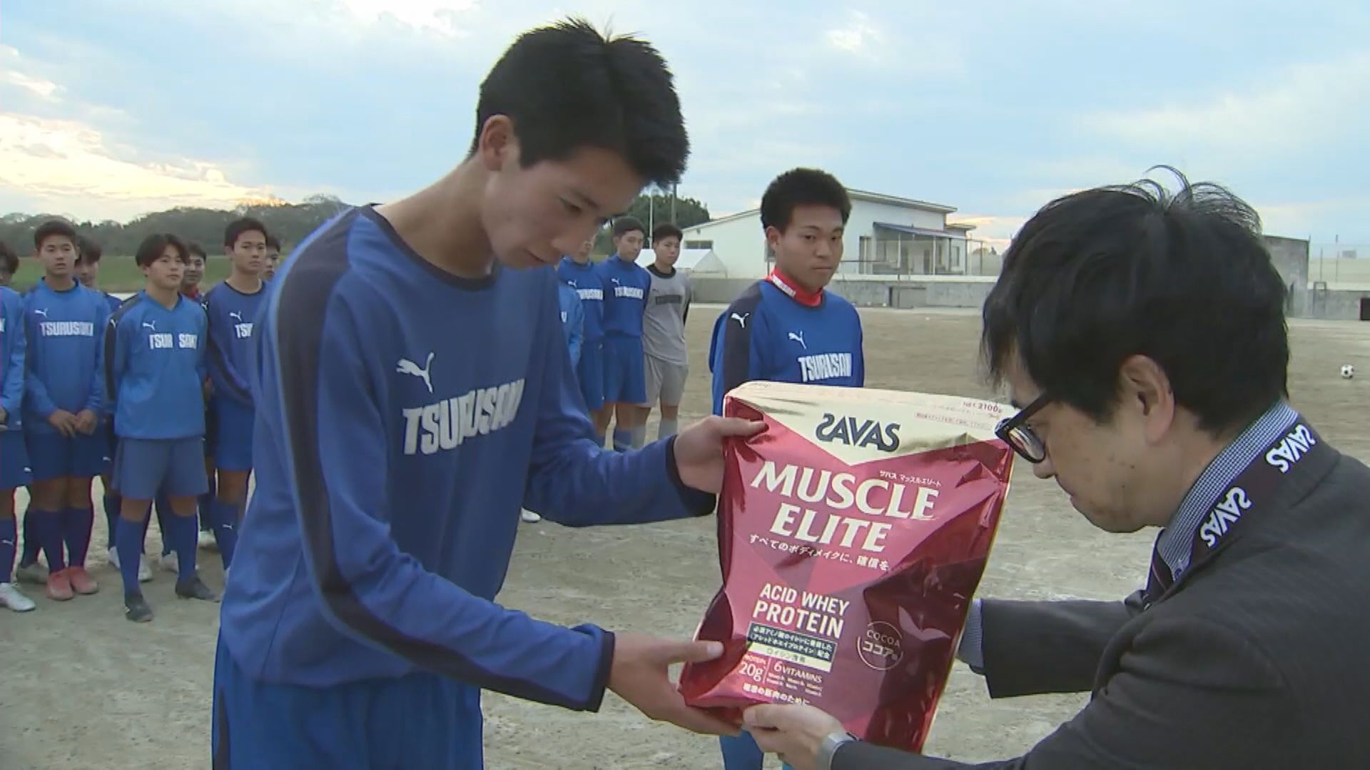 11日は大分市の大分鶴崎高校で贈呈式が行われ、帝人からはサッカーボール10個とボールケース、明治からはプロテインが選手たちに贈られました。