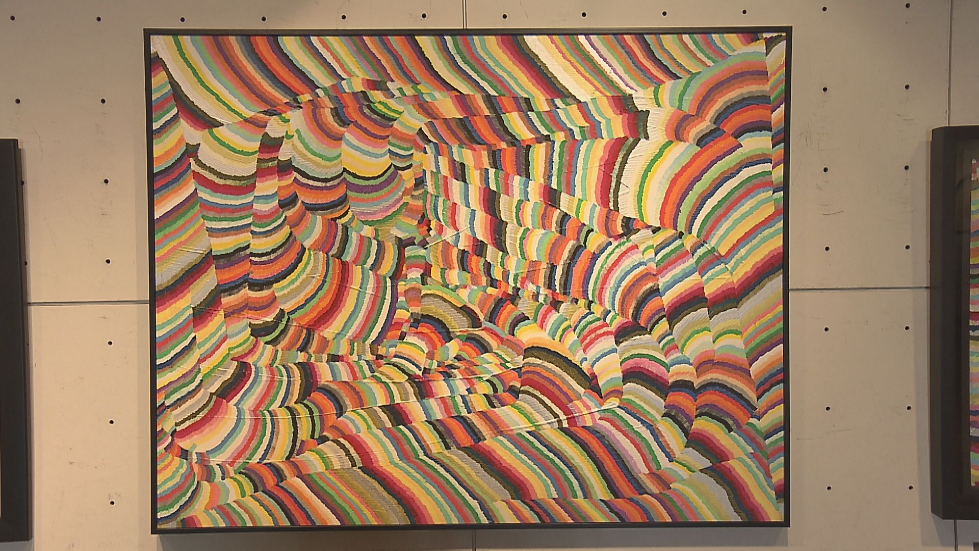 こちらは国東市の古城貴博さんの絵画です。下絵なしでペンを変えながら色を連ねていく独特の方法で描かれています。