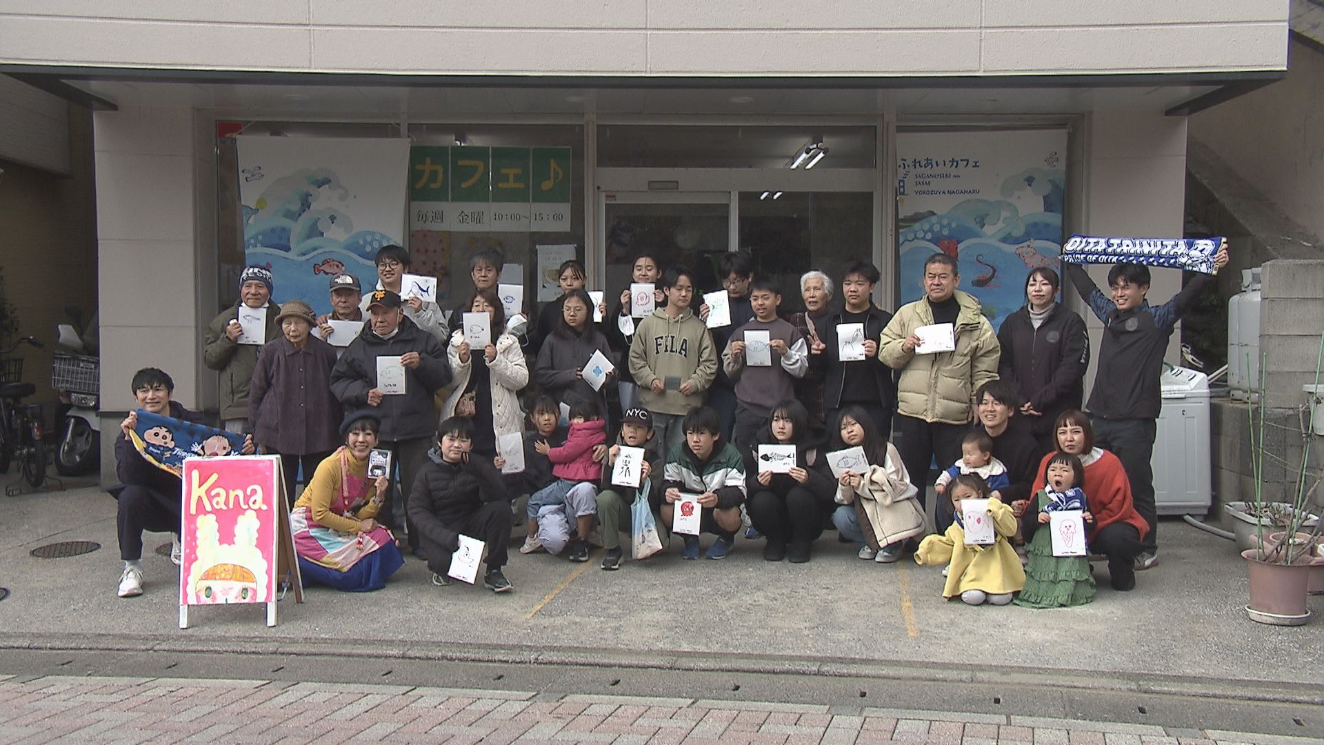 このワークショップは大分トリニータと地元企業や学生などで作る団体、佐賀関連絡会が開催しました。ワークショップは佐賀関で活動する現代美術家のKanaさんが講師を務め、参加したおよそ30人にそれぞれ好きな絵を描いてもらいました。その絵をKanaさんが1枚のマフラータオルにまとめ今後デザインするということです。