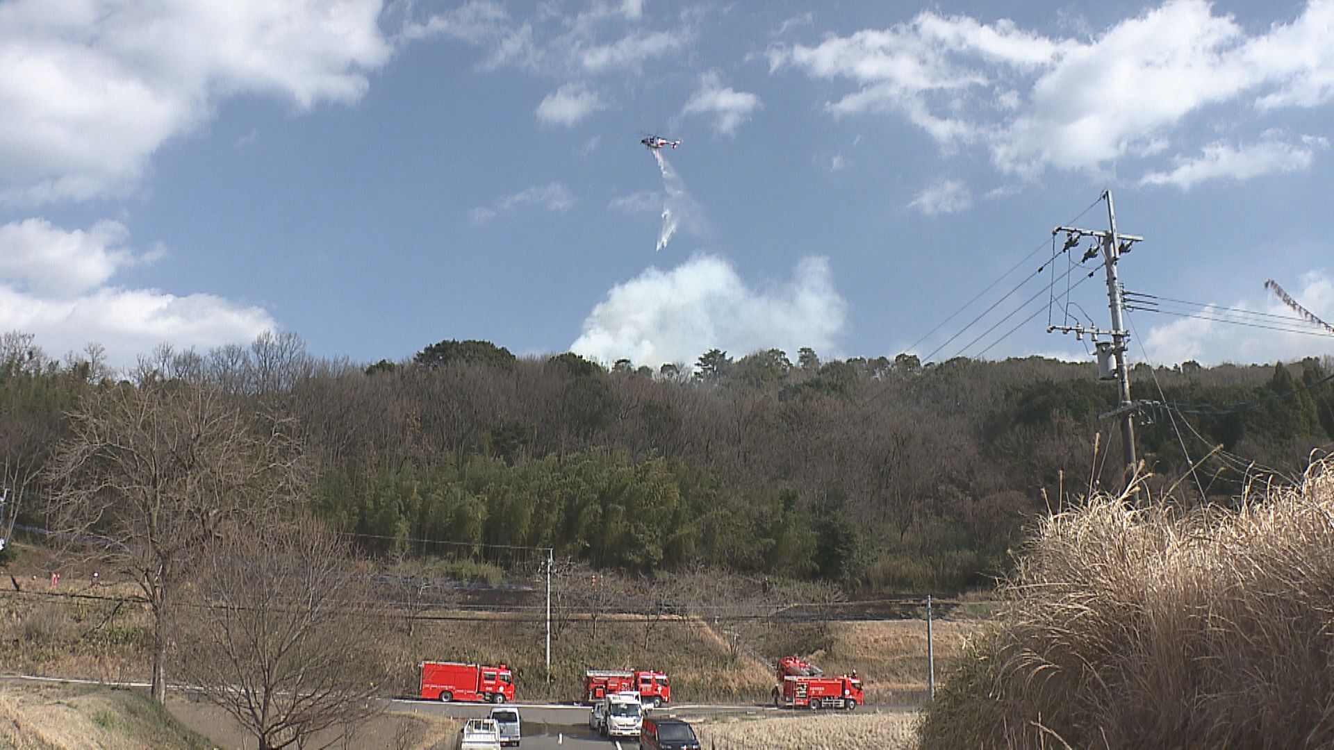 「白い煙が立ち上っています。現場はやや強い風が吹いています。消防、そしてヘリコプターが消火活動を続けています」