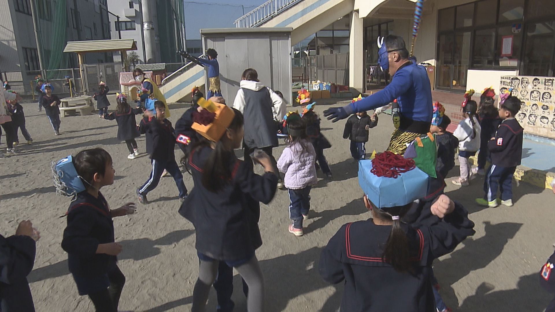 2日は園児およそ170人が手作りした鬼のお面をつけて節分の歌やダンスを楽しみました。その後始まった豆まきでは園庭に鬼に扮した職員2人が登場。中には、あまりの迫力に泣き出してしまう子も。
