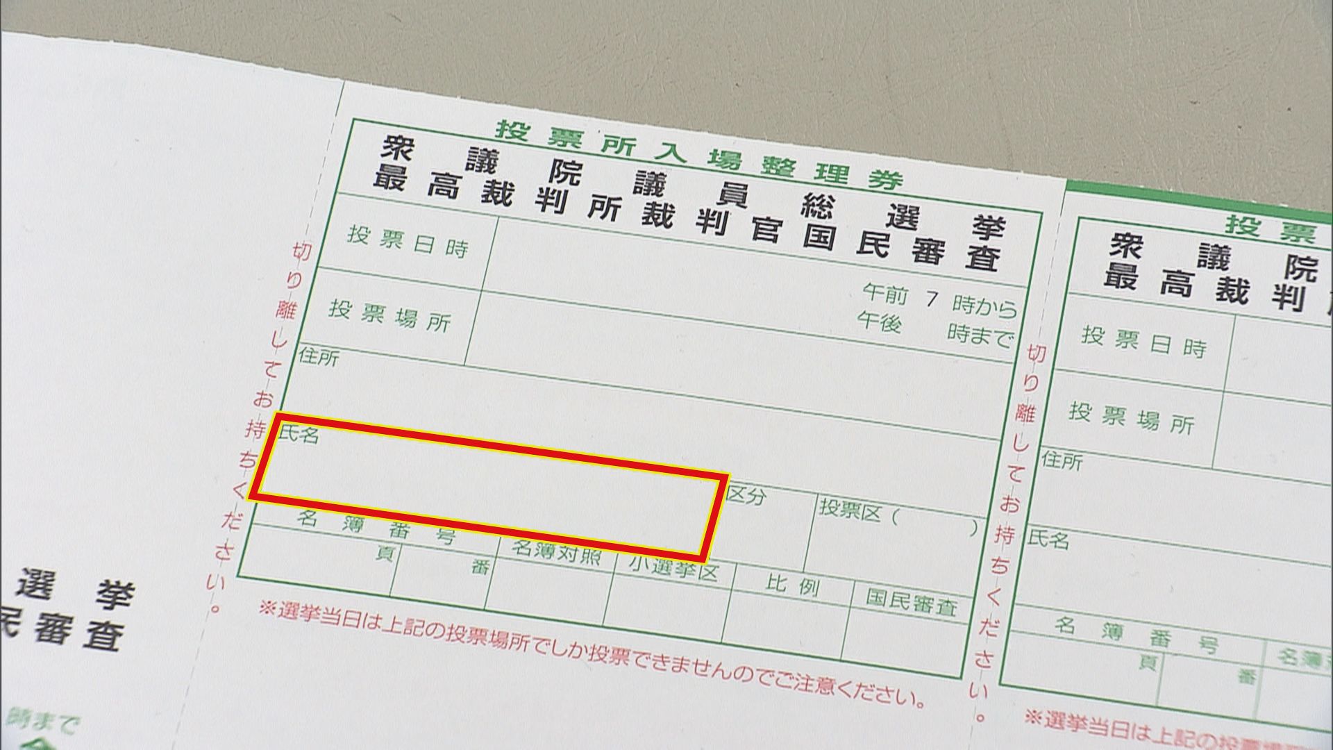 こちらが入場整理券の見本です。表紙に書かれた世帯主の名前と、有権者の名前を間違えたものがあったということです。