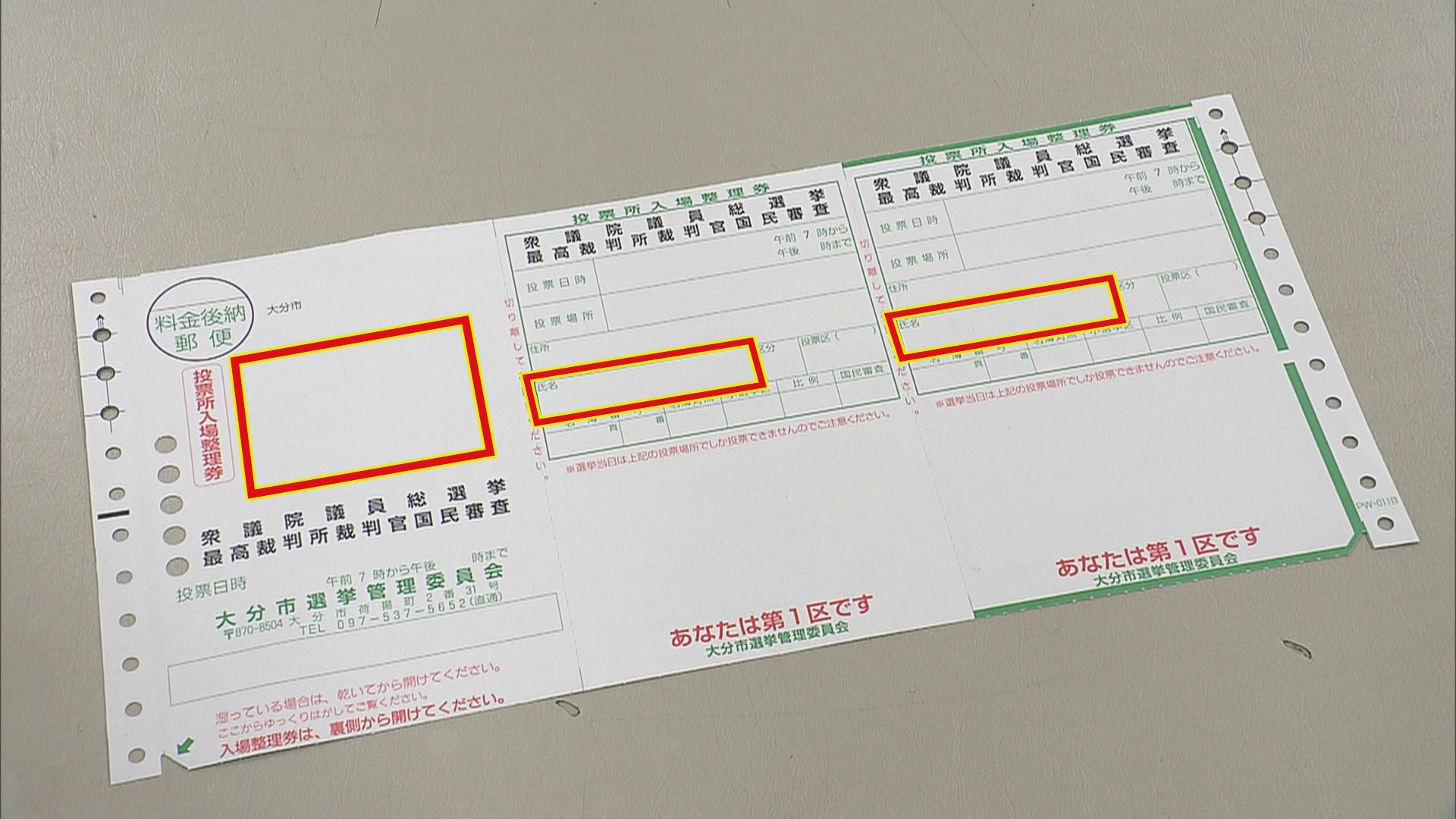 衆議院議員選挙の投票所の入場整理券について大分市選挙管理委員会は有権者に発送したものの一部に名前が誤って印刷されたものがあったと発表しました。