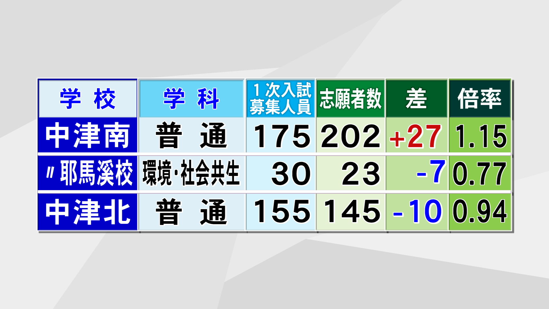 中津南は175人の募集に対し202人が志願していて倍率は1.15倍。
