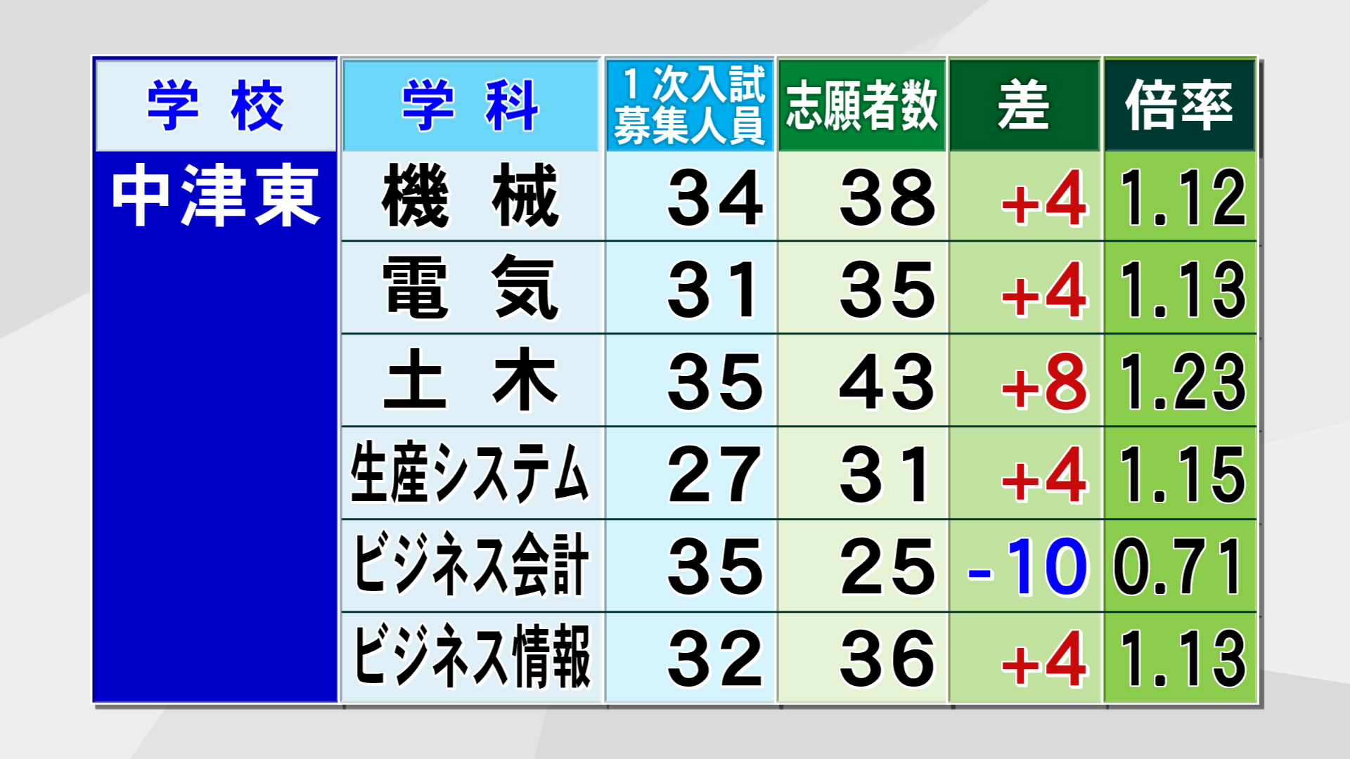 大分商業は商業科で1.38倍、情報処理科で1.1倍、国際経済科は募集人員を下回りました。