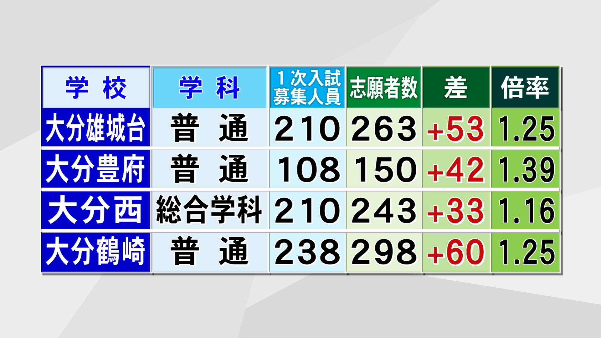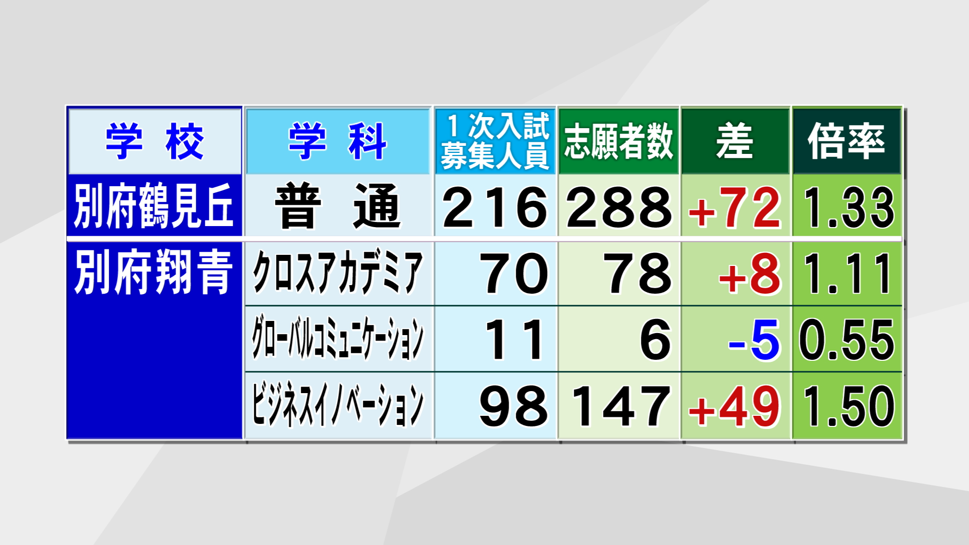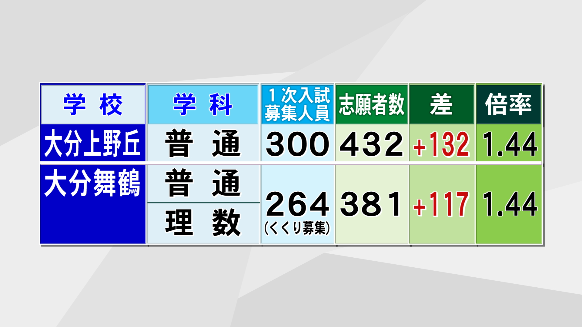 普通科と理数科でくくり募集をする大分舞鶴も1.44倍で、大分上野丘と並び学校別の倍率が最も高くなっています。