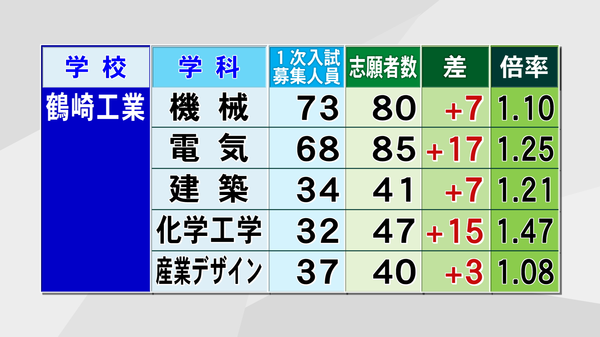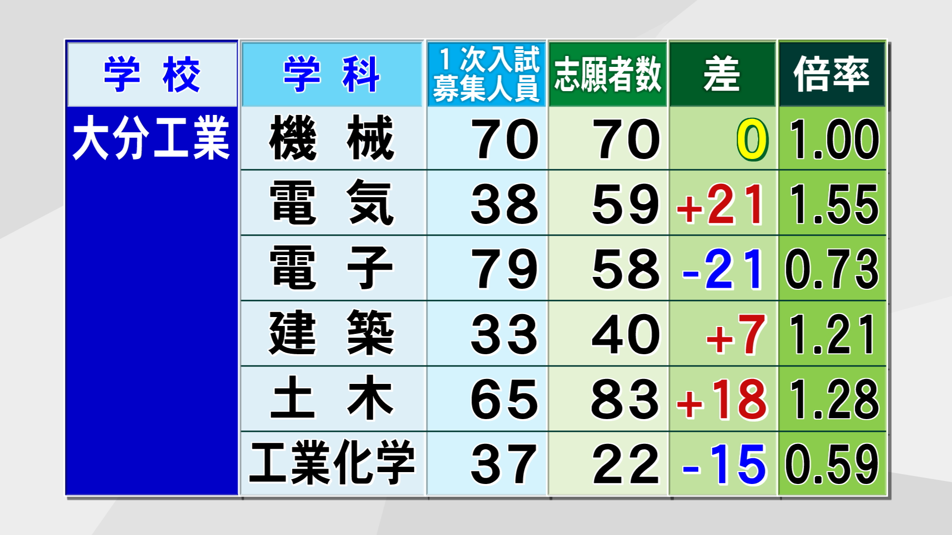 鶴崎工業は5つある学科すべてで募集人員を上回りました。最も高いのは化学工学科で1.47倍となっています。