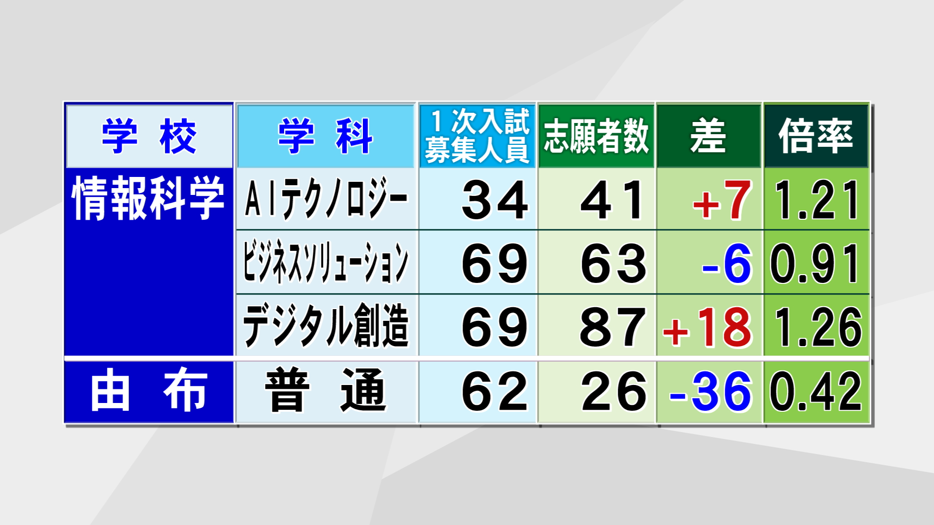 情報科学はAIテクノロジー科が1.21倍、デジタル創造科が1.26倍で、ビジネスソリューション科は募集人員に達しませんでした。