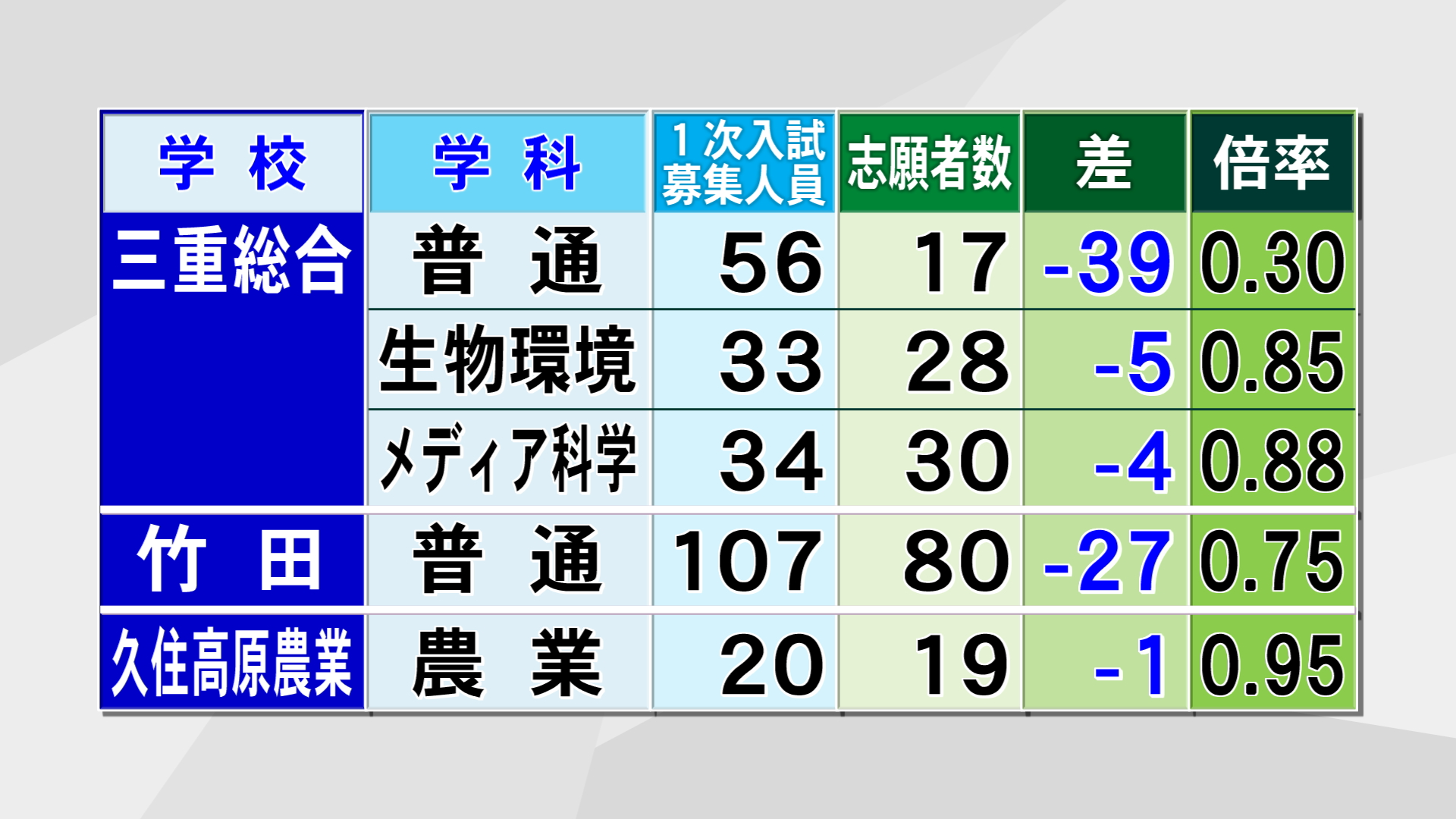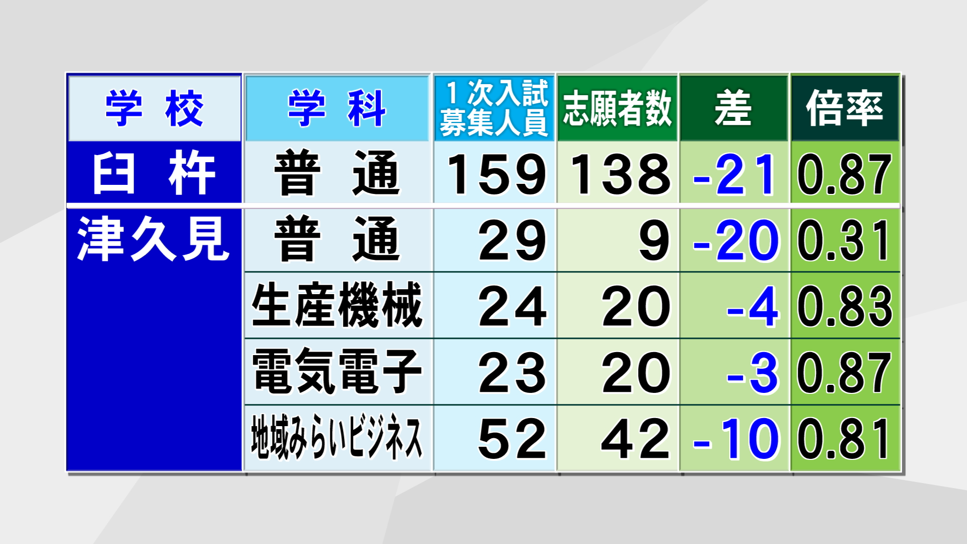 津久見は全ての学科で募集人員に達しておらず、普通科では29人の募集に対し志願者は9人となっています。