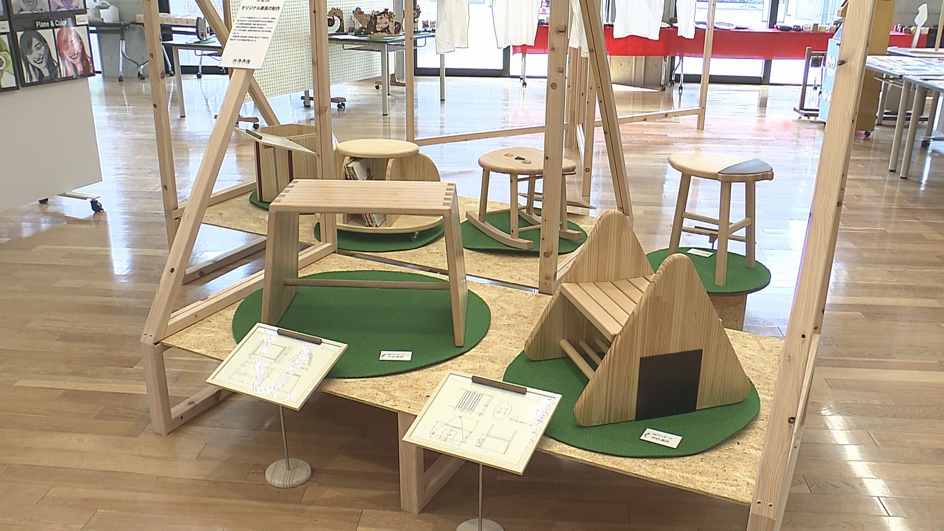 パソコンを使って制作した華やかなタペストリーや、子供が安全に楽しみながら使える木の椅子など工夫を凝らした作品が並んでいます。