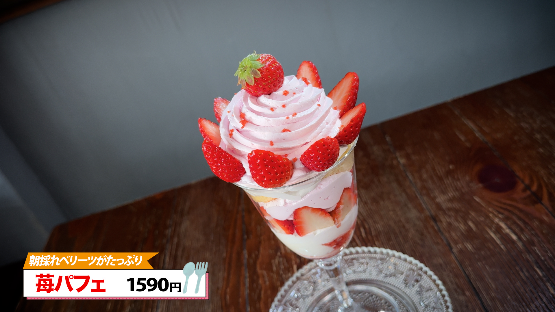 運ばれてきたパフェを見た瞬間、おのりリポーターは思わず声を上げます。「こんなにかわいいパフェを見たの初めてです」。グラスには15〜16粒もの大分県産いちごベリーツが使用され、いちごクリーム、スポンジ、パンナコッタなどが美しく層を成しています。