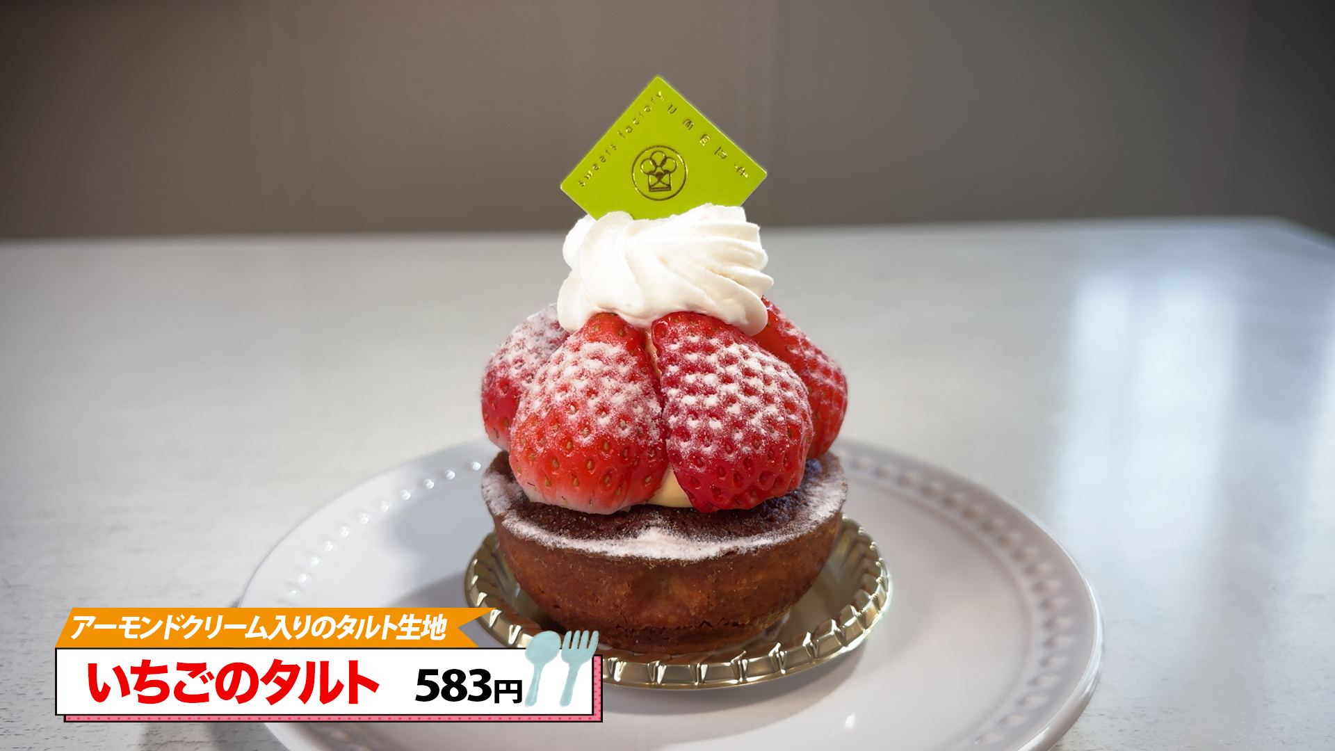 彩花リポーターが味わったいちごのタルトも、アーモンドクリームを入れて焼き上げたタルト生地の上にカスタードクリームといちご、さらに生クリームが添えられた逸品。