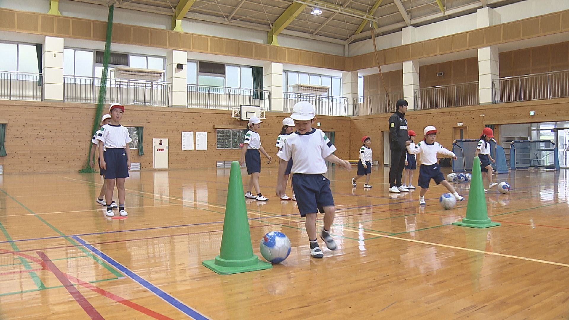 子供たちはトリニータが運営するサッカースクールのコーチと一緒にドリブルやキックの練習をした後ミニゲームを行い、楽しそうに体を動かしていました。
