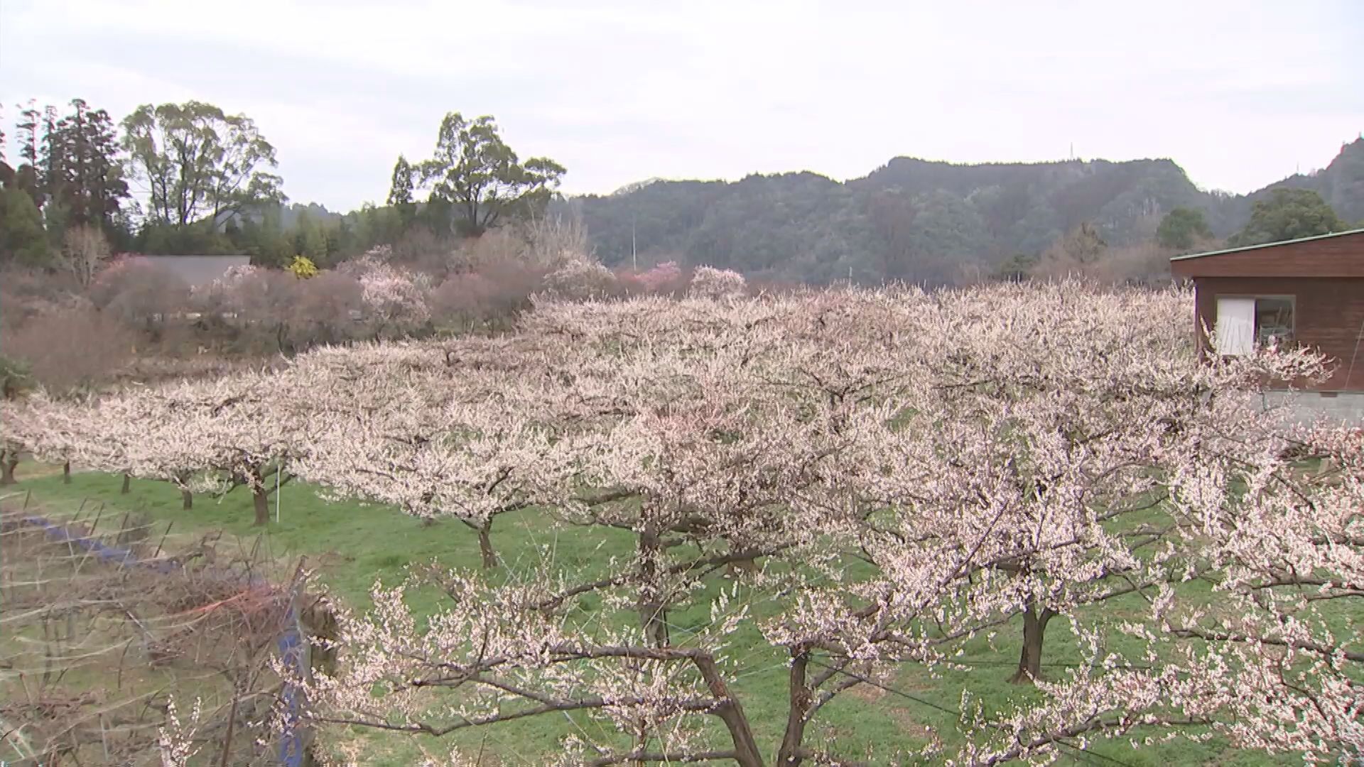開催中の「日田おおやま梅まつり」の会場の1つおおくぼ台梅園ではおよそ8ヘクタールの敷地に6000本ほどの梅が植えられていてまさに今が満開。山肌を美しく彩っています。