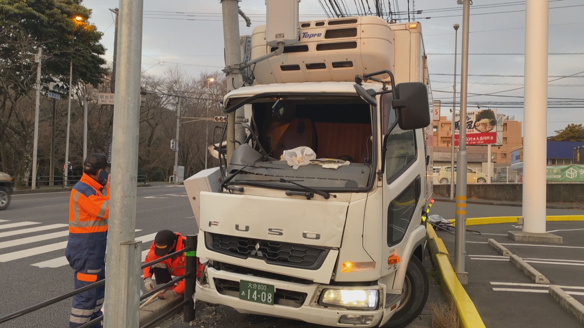 6日朝早く、大分県大分市の県道でトラックが歩道に乗り上げ、信号機に衝突する事故がありました。