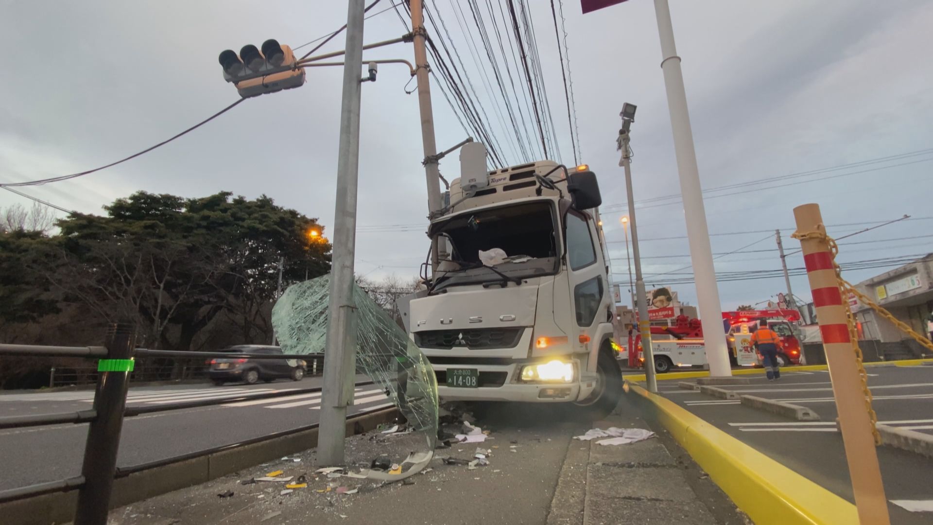 トラックが信号機に衝突です。