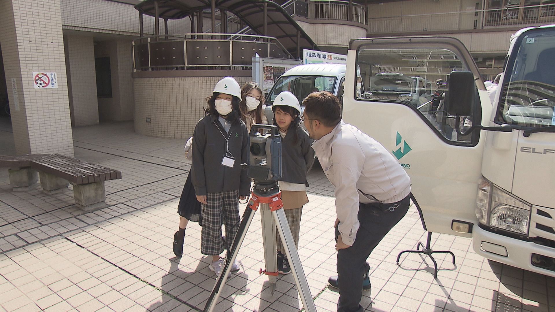 小中学生が地元企業の仕事を体験 建設会社のブースではヘルメットとユニホーム着用し測量作業も 大分