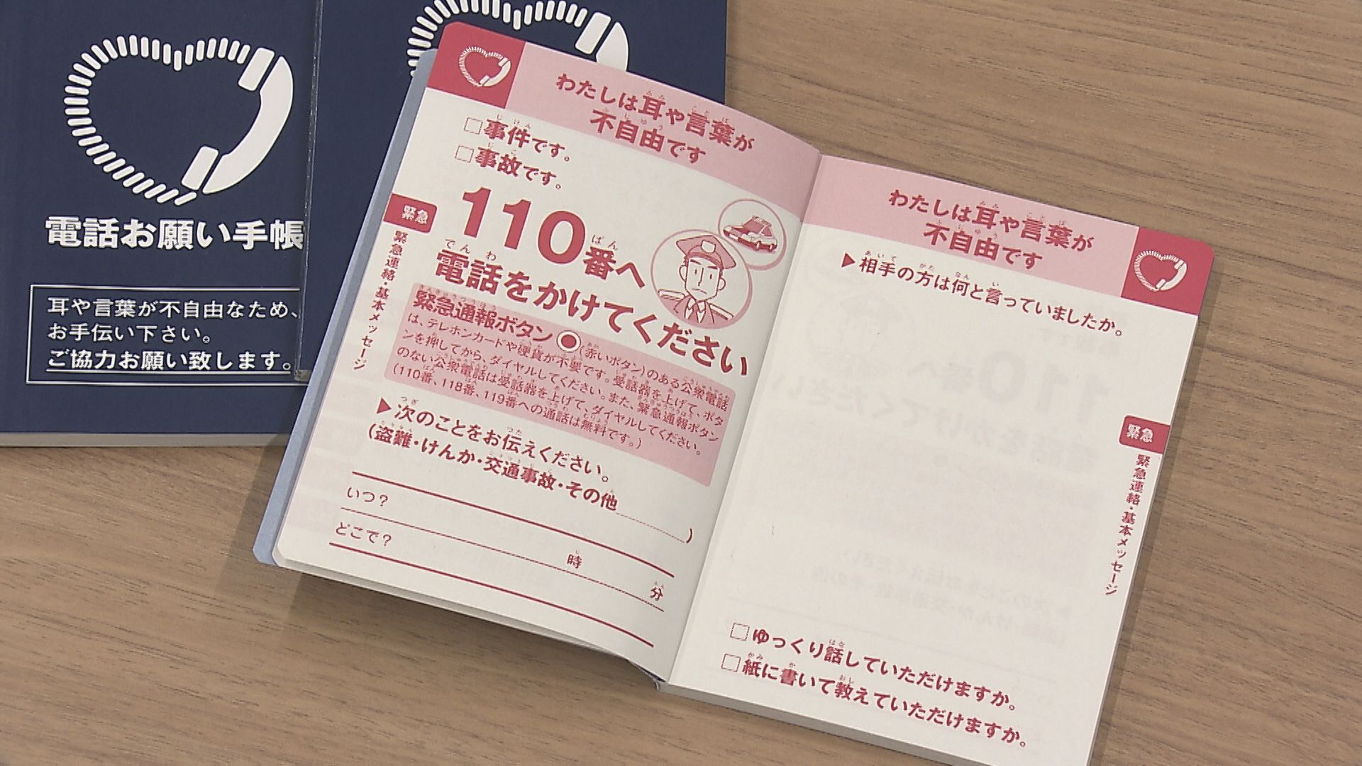 手帳には「110番へ電話をかけてください」などと書かれています。