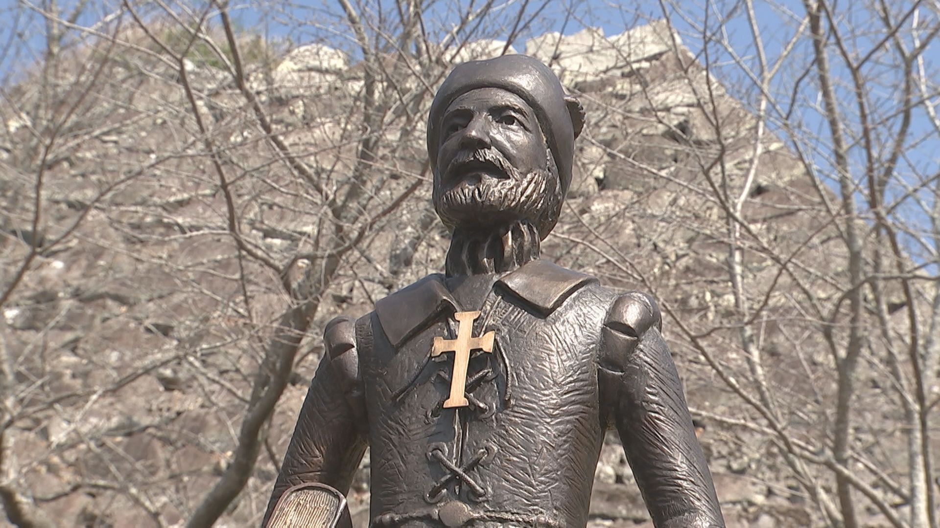 1510年に生まれたとみられる旅行家のピントの銅像が城下公園に設置されました。