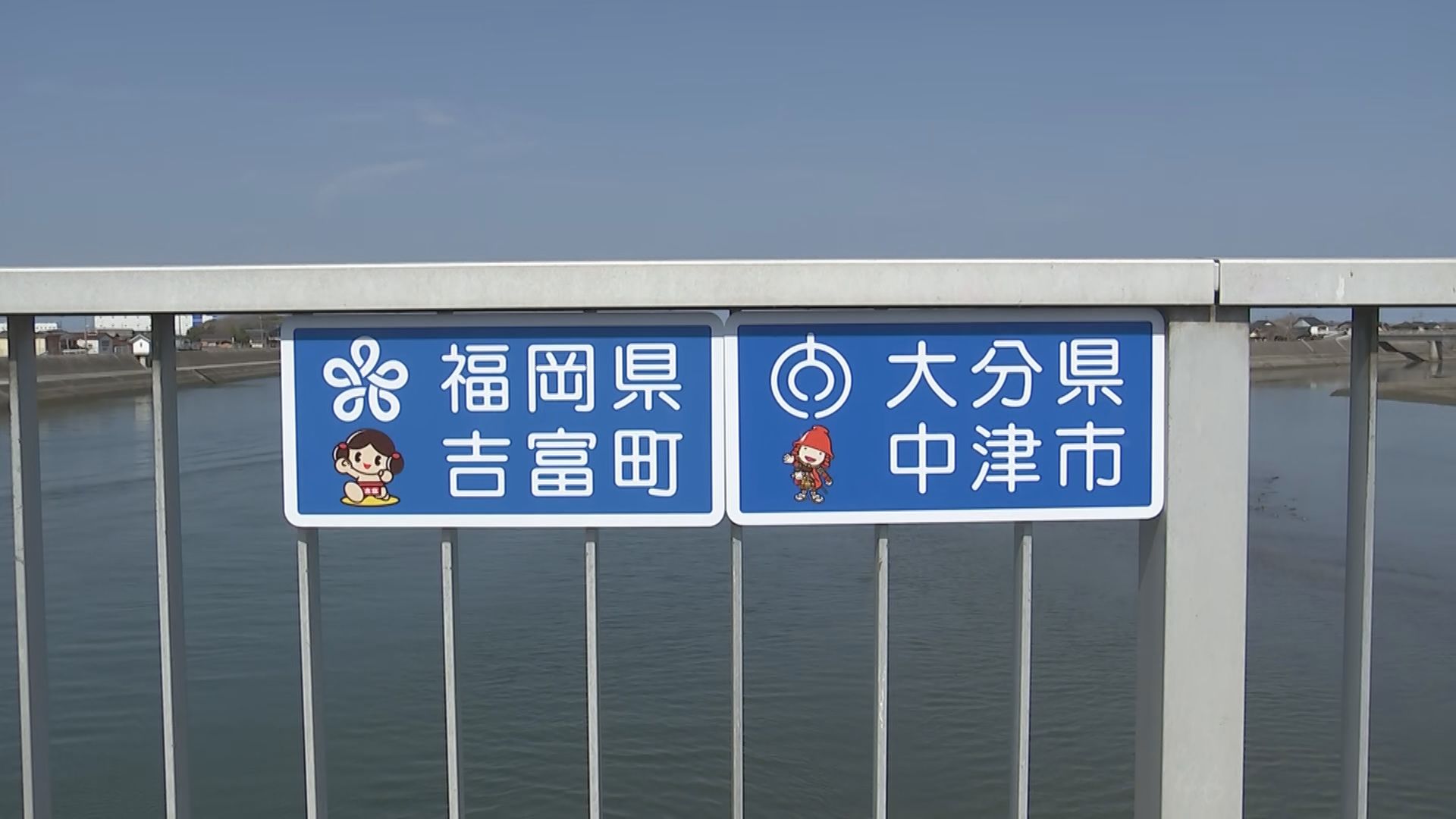 大分県中津市と福岡県を結ぶ橋に県境を示す新たな案内標示が設けられました。