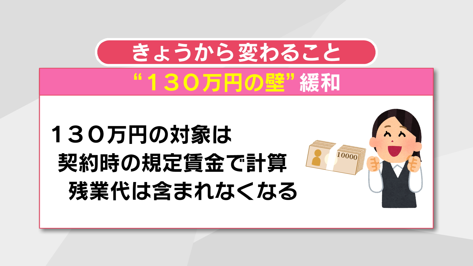 続いて、いわゆる“130万円の壁”の緩和です。これまで、会社員の扶養に入っている人は残業代などを含む年収が130万円を超えると扶養から外れ年金や医療の保険料を納める義務が生じていました。