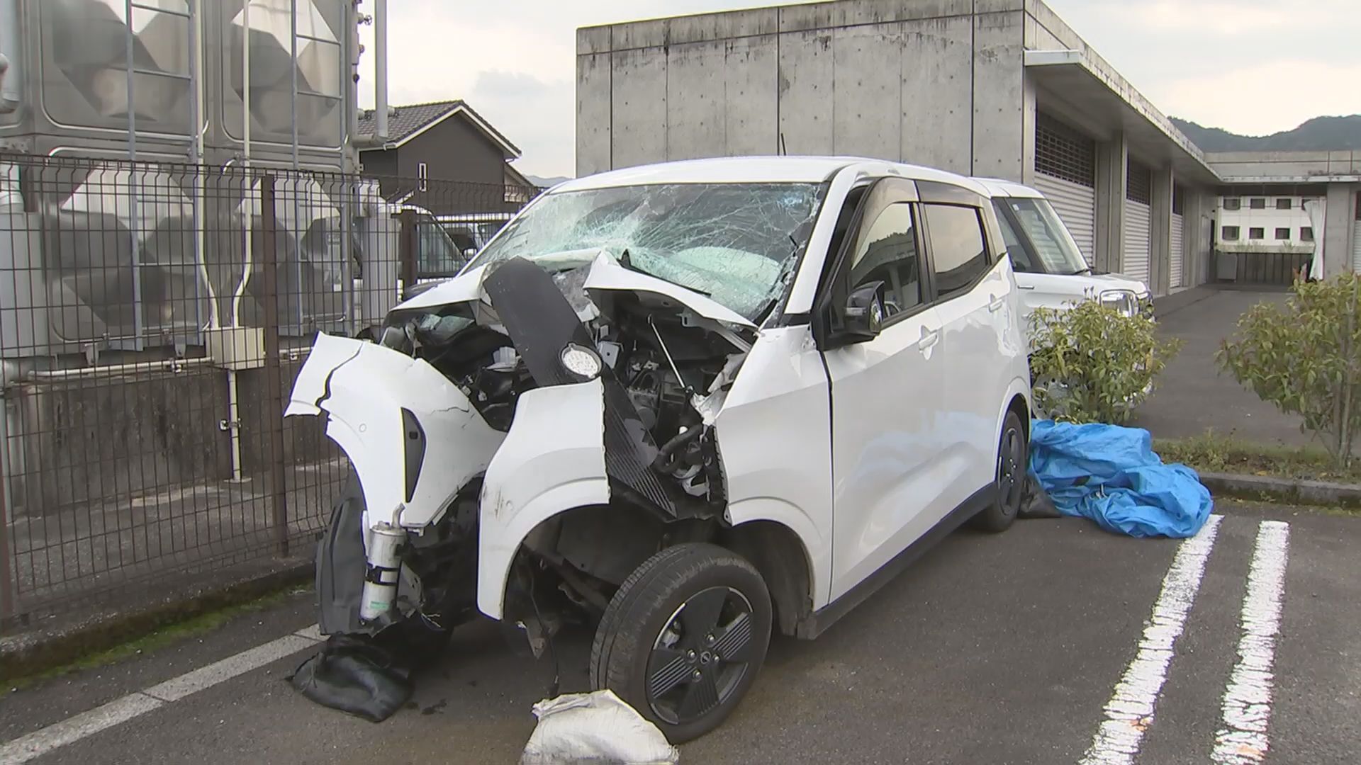 フロント部分を中心に大きく壊れた車。中央部分が大きくへこんでいて、事故の衝撃の強さがうかがえます。