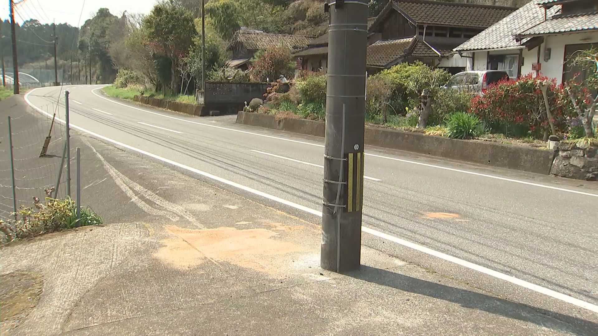 当時、車は重岡方面から河内方面に走行していました。現場は片側1車線の見通しの良い緩やかな左カーブで車は対向車線を横切って電柱に衝突したということです。