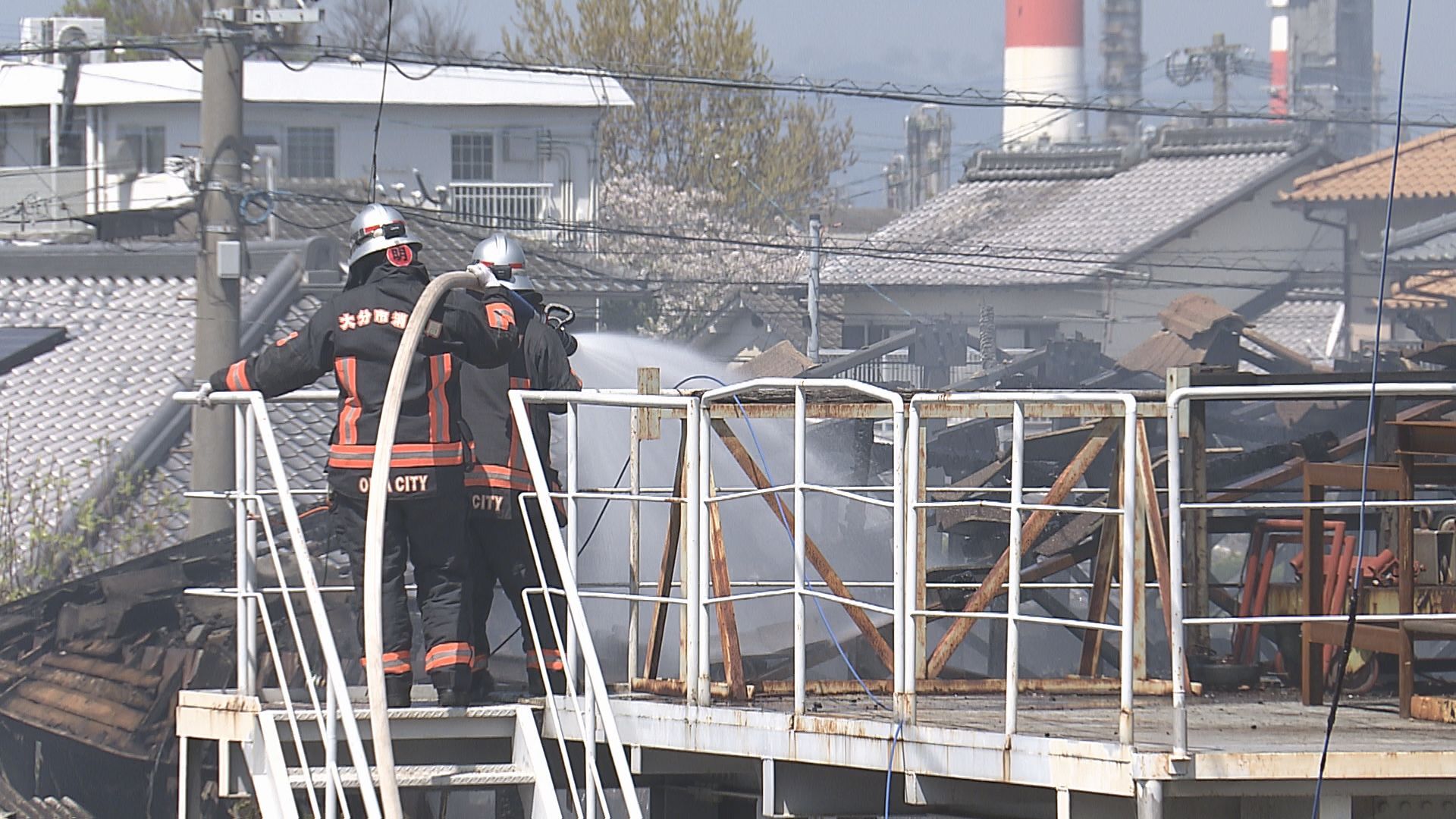 「火災の発生から40分以上が経ちましたが、今もなお白煙が上がり続けていて、消火活動が続いています」