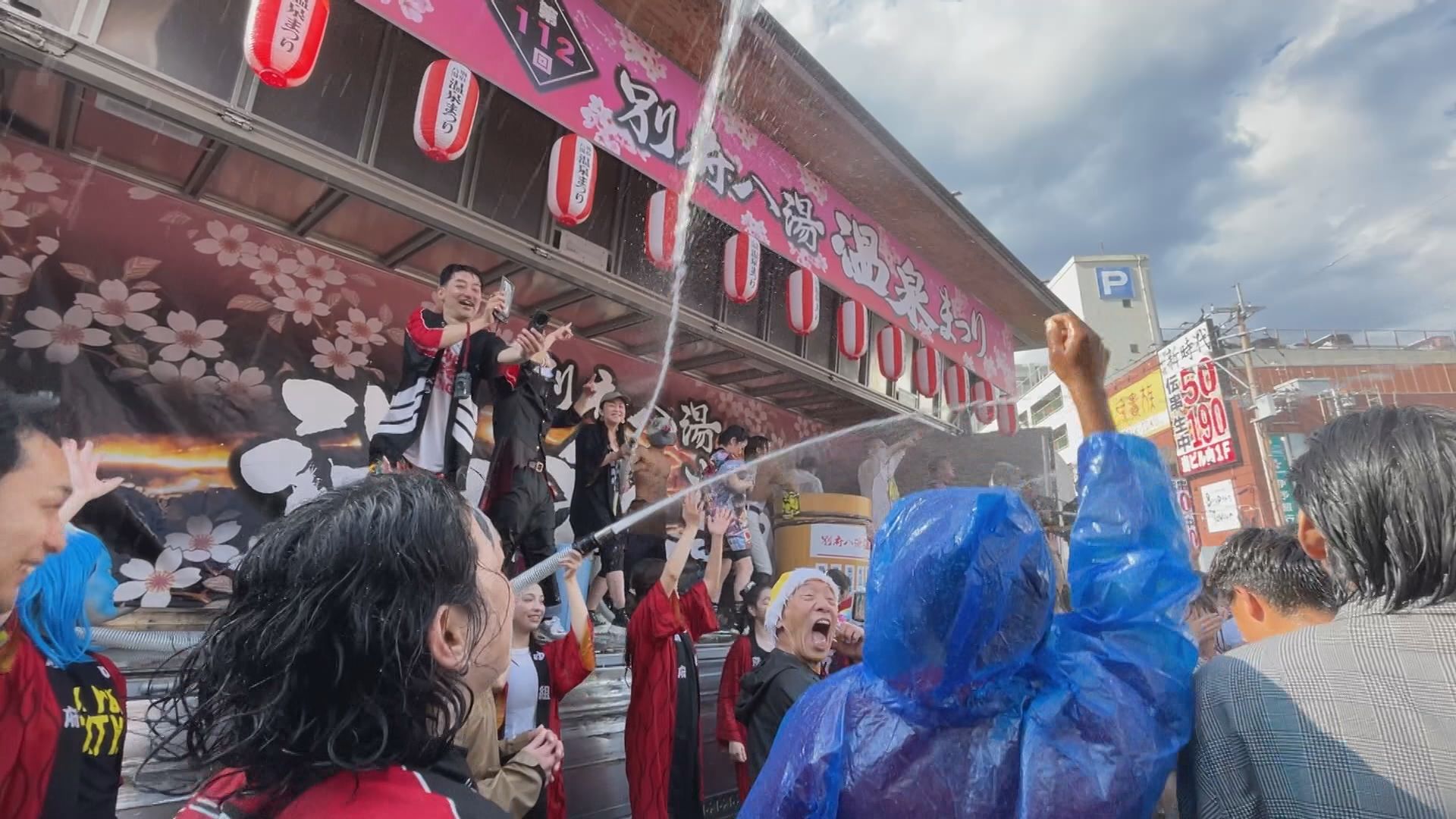 祭りの名物「湯ぶっかけまつり」です。その名の通り、温泉のお湯をかけあって楽しむイベントです。