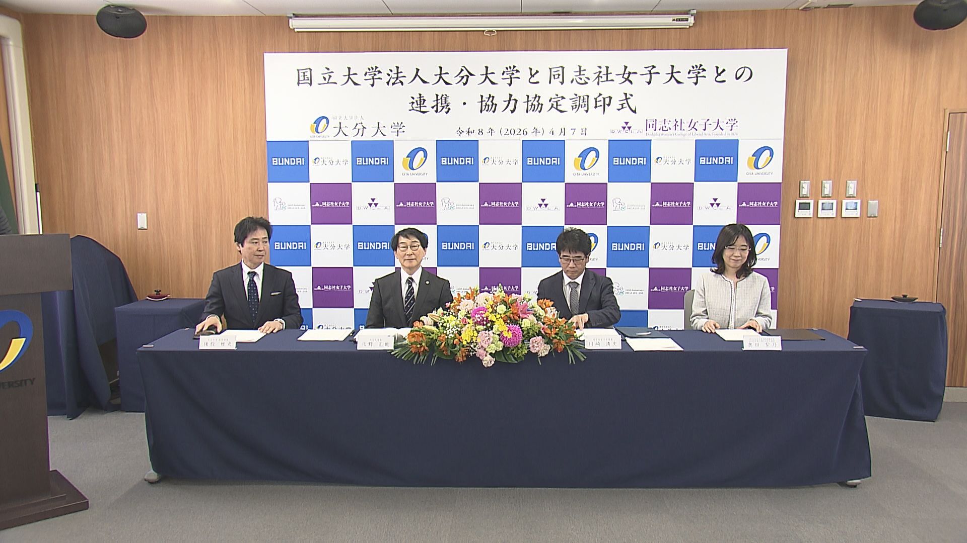 大分大学では7日、北野正剛学長や同志社女子大学の川崎清史学長など関係者が出席して調印式が行われました。今回結ばれた連携協定には、同志社女子大学薬学部の学生の実務実習を大分大学医学部附属病院で受け入れることなどが盛り込まれています。