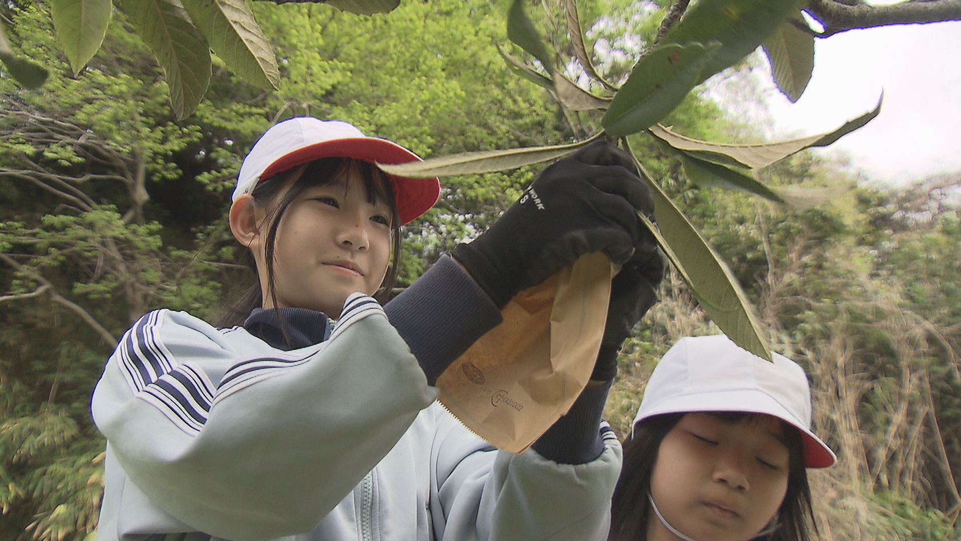大分県大分市田ノ浦地区の特産品であるビワを害虫などから守る袋掛けに地元の小学生が挑戦しました。
