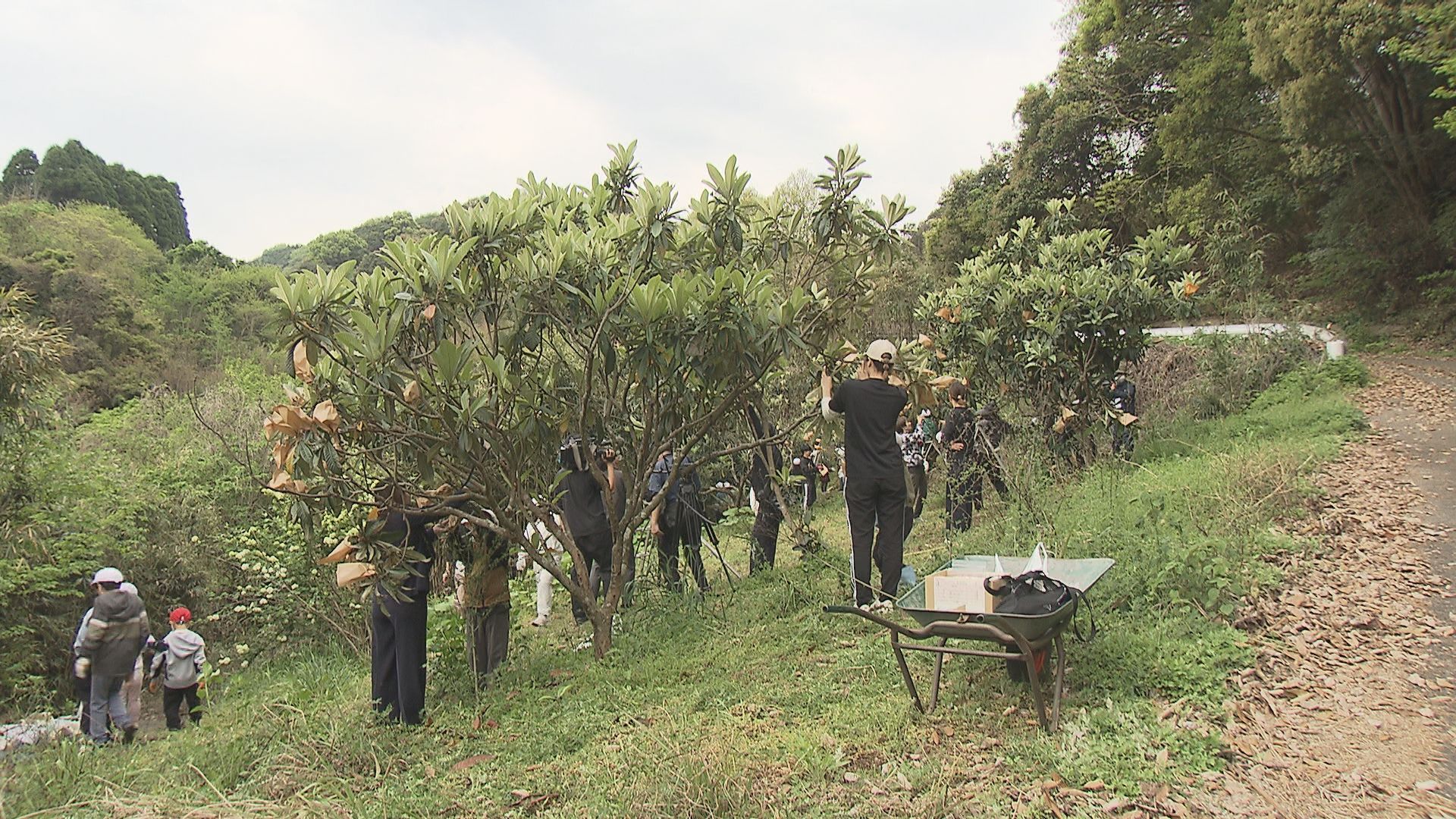 大分市の神崎小学校では地域の産業でもあるビワづくりを子供たちに知ってもらおうと毎年この時期に学校近くの畑で袋掛けの体験を行っています。