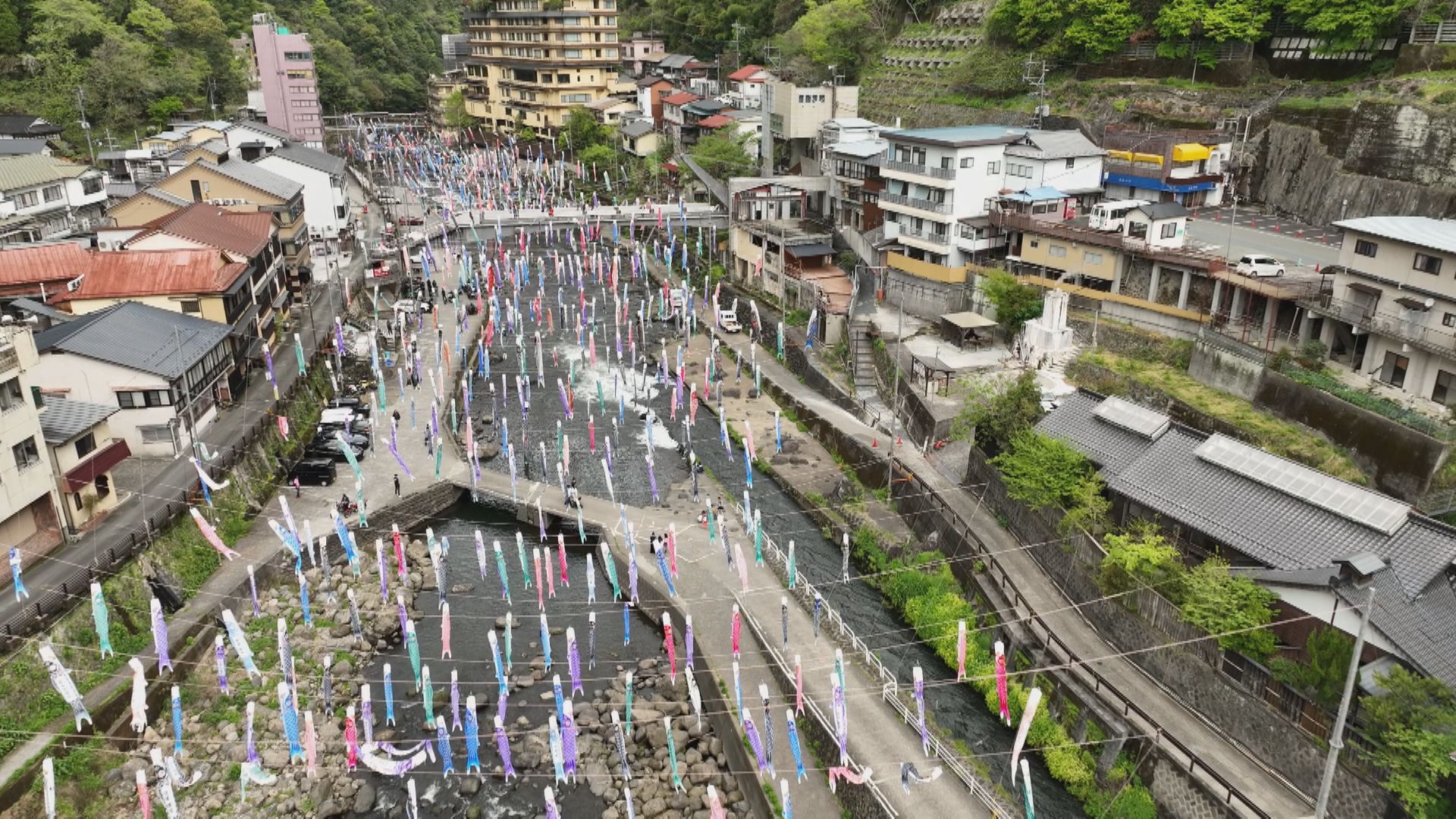 温泉街を流れる川の上で春風に揺られているのはおよそ3000匹のこいのぼり。800メートルほどにわたって圧巻の光景が広がっています。
