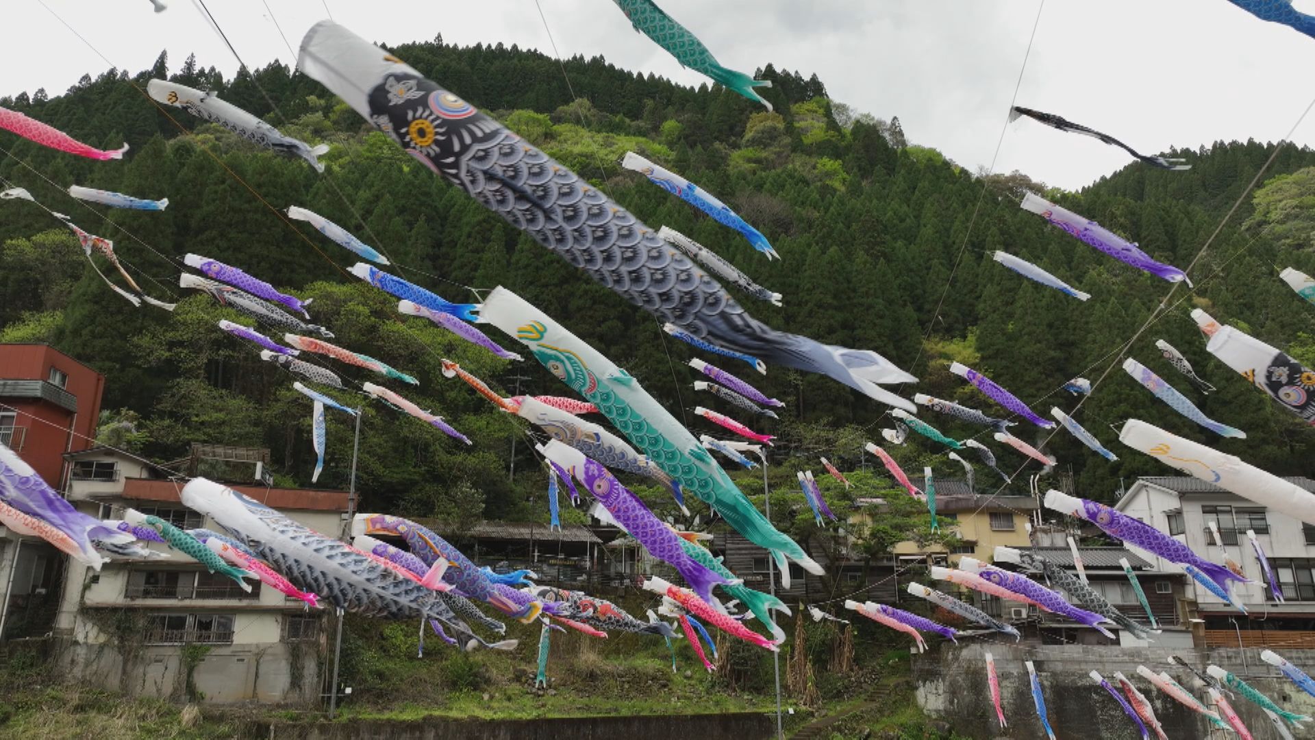 「温泉の香りが漂う中、こちらでは多くのこいのぼりが空に向かって泳いでいます」