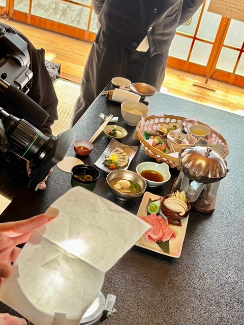 そして国の重要文化財に指定されている的山荘では「ひじ雛めぐり」限定メニューを頂きました。籠森に春を感じさせるお料理が小鉢で並び、また牛肉のしゃぶしゃぶやフグのたたきなど、素材の味を生かしつつ、的山荘でしか味わえない繊細で豪華なお料理が満載でした。室内も明治時代の波ガラスが使用されていたり、随所に趣を感じました。