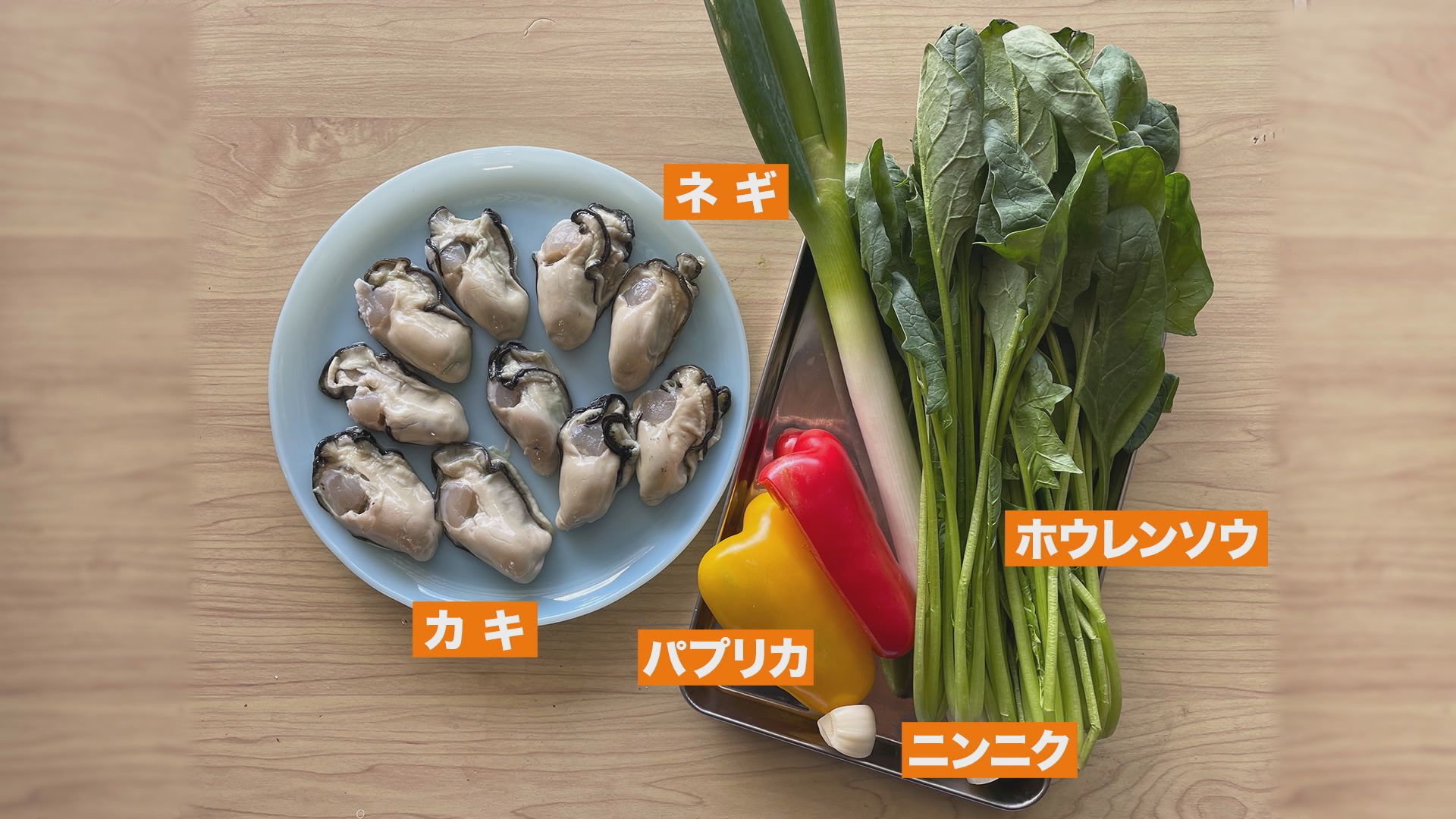 ・カキ ・白ネギ ・パプリカ ・ホウレンソウ ・ニンニク ・料理酒 ・しょうゆ ・うま味調味料 ・塩 ・コショウ ・甜面醬(てんめんじゃん) ・豆板醤 ・ごま油 ・水 ・片栗粉