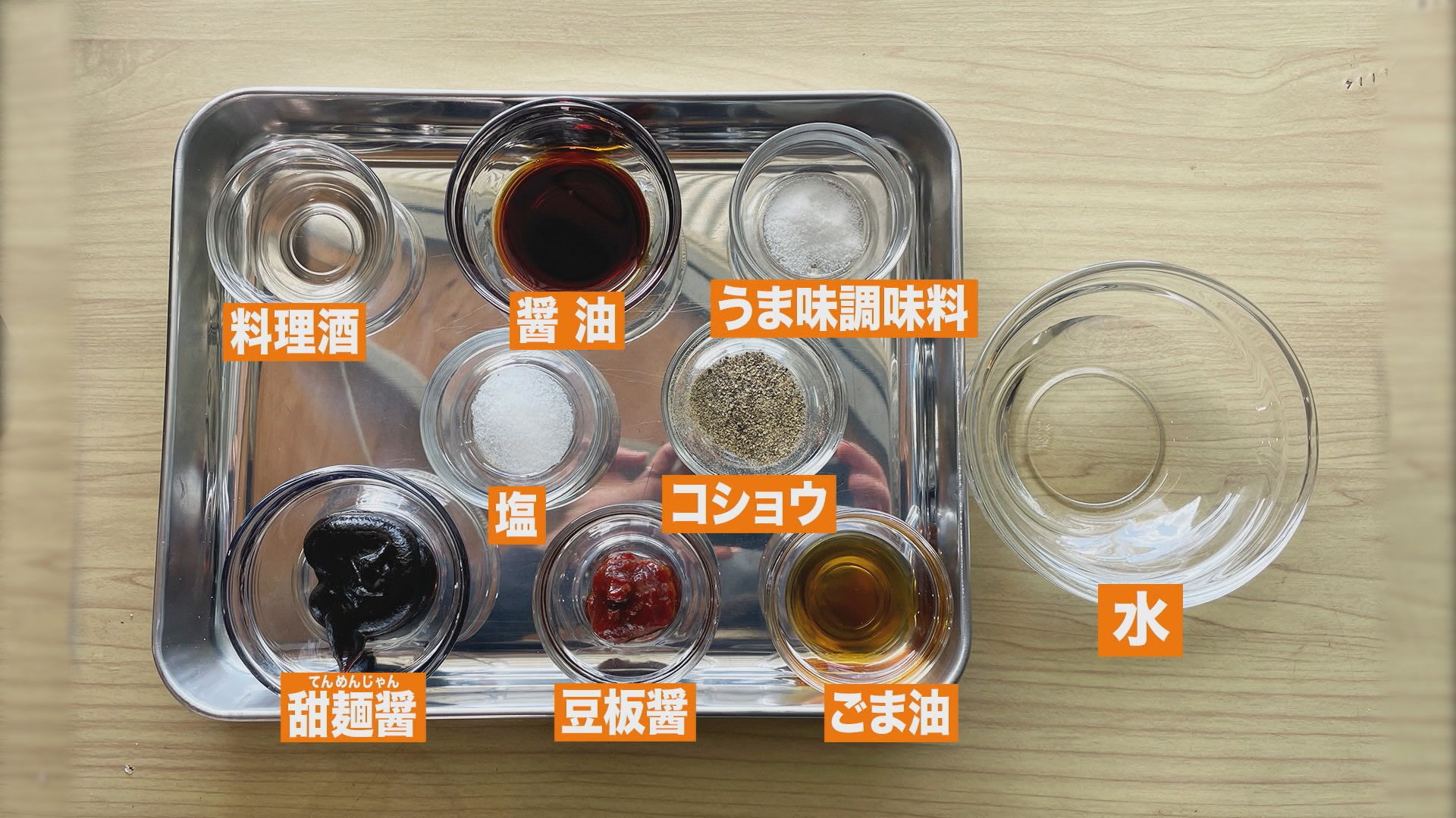 ③合わせ調味料を作る。ボウルにしょうゆ、甜面醤、塩、うま味調味料、料理酒を入れ、水を少し加えてのばす。