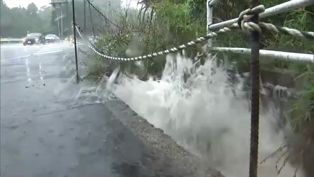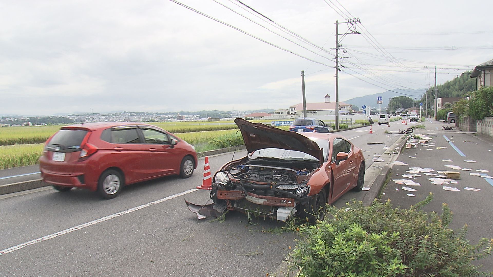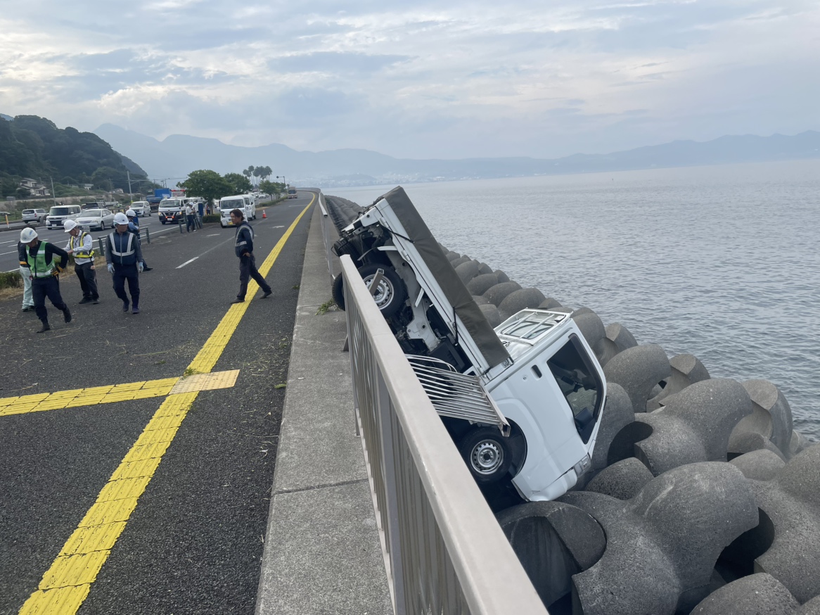 別大国道で軽トラックが柵倒し、海近くに転落 草刈り作業中の車と衝突 大分