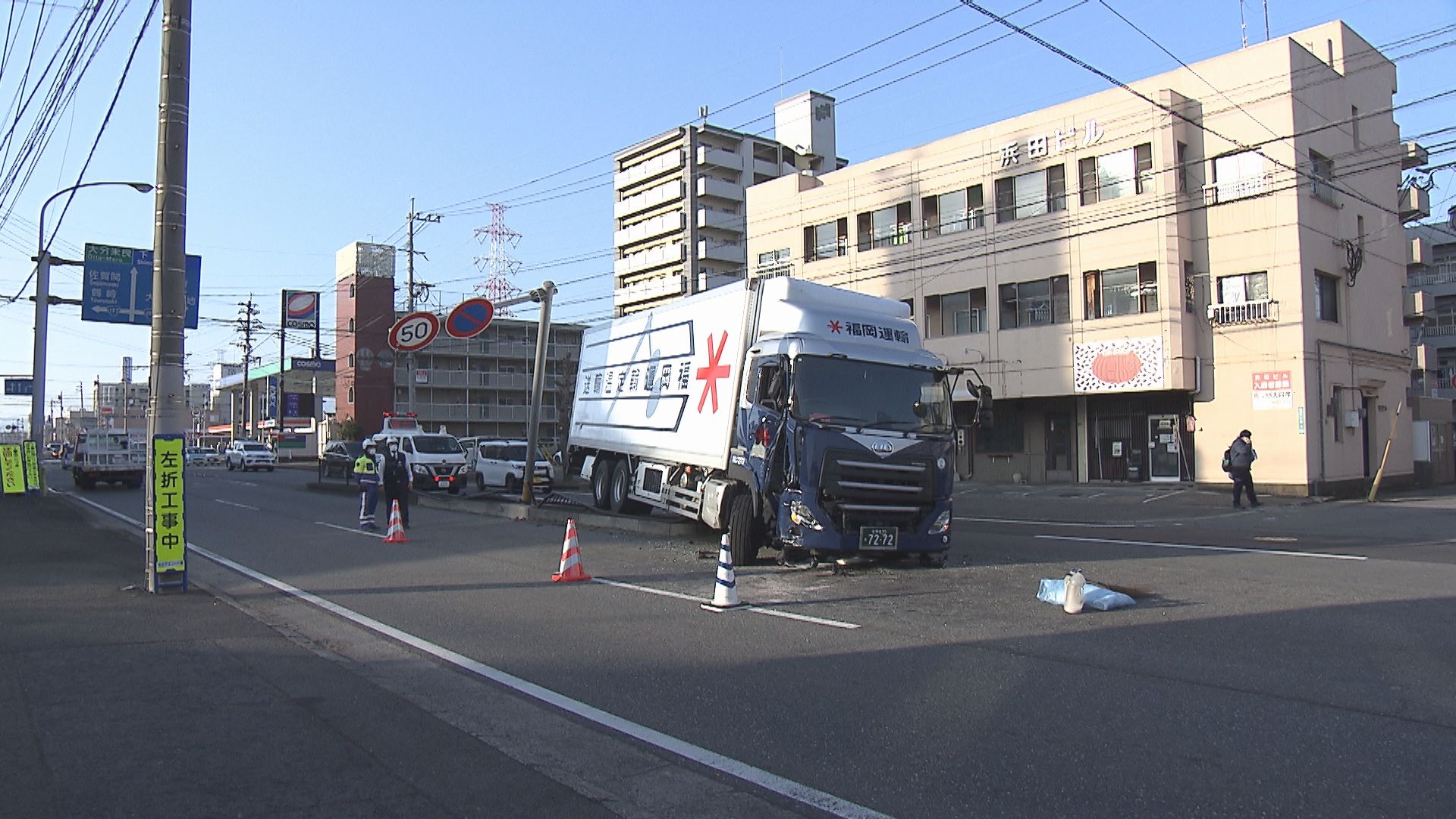 県道でトラックが中央分離帯を乗り越え道路標識や柵なぎ倒す 周辺には破片が散乱 大分